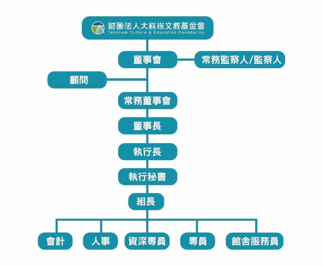本會置董事長、常務董事、董事、常務監察人、監察人、顧問、執行長、執行秘書、組長、資深專員、專員、會計、人事、館舍服務員等。