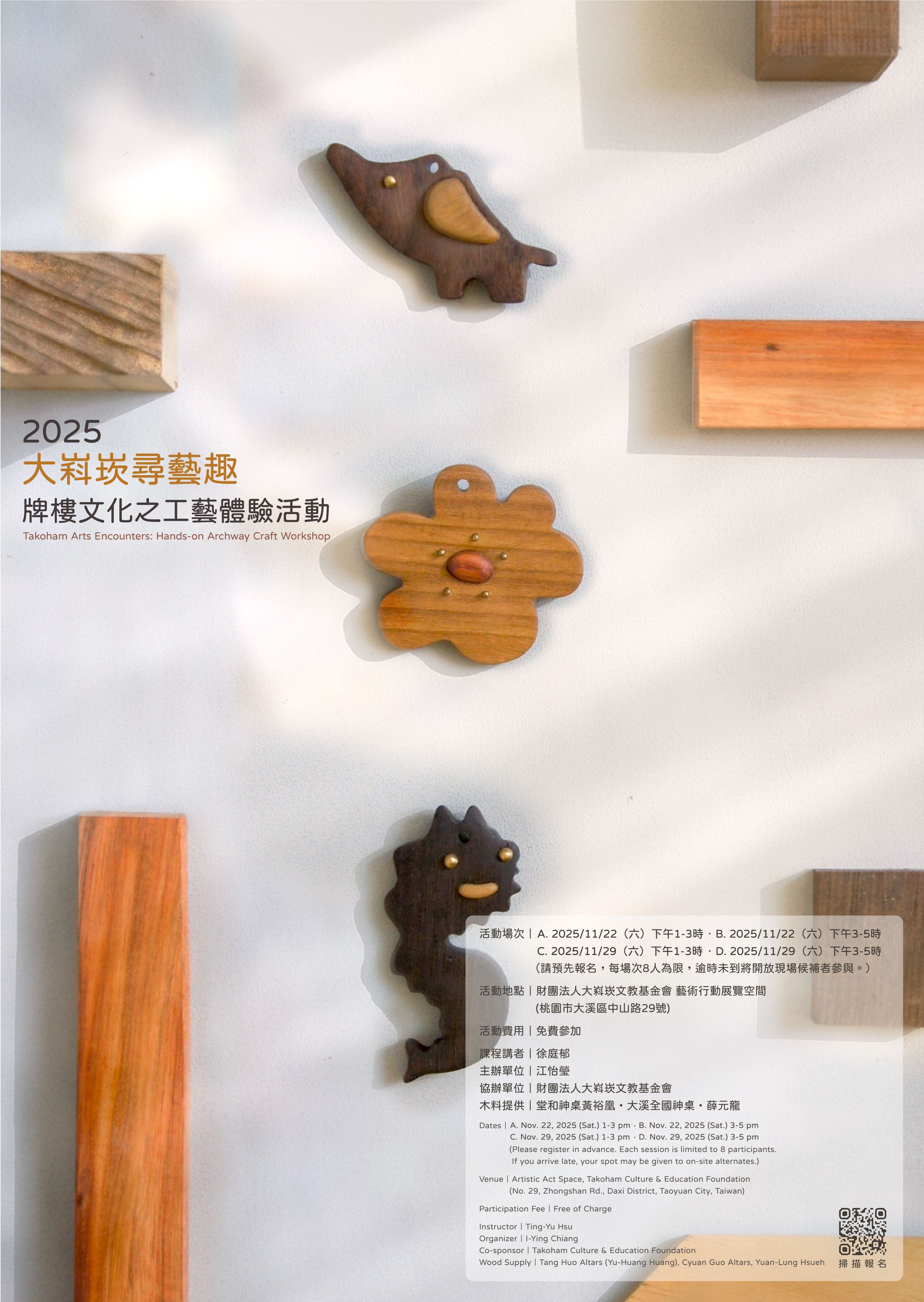 本活動以大溪老街的牌樓文化為靈感,將浮雕紋樣轉換為木質吊飾的工藝體驗活動。參與者透過親手製作的過程,將歷史圖像轉化為隨身可攜的精巧飾物,不僅體驗傳統工藝之美,也使文化記憶近身可感。